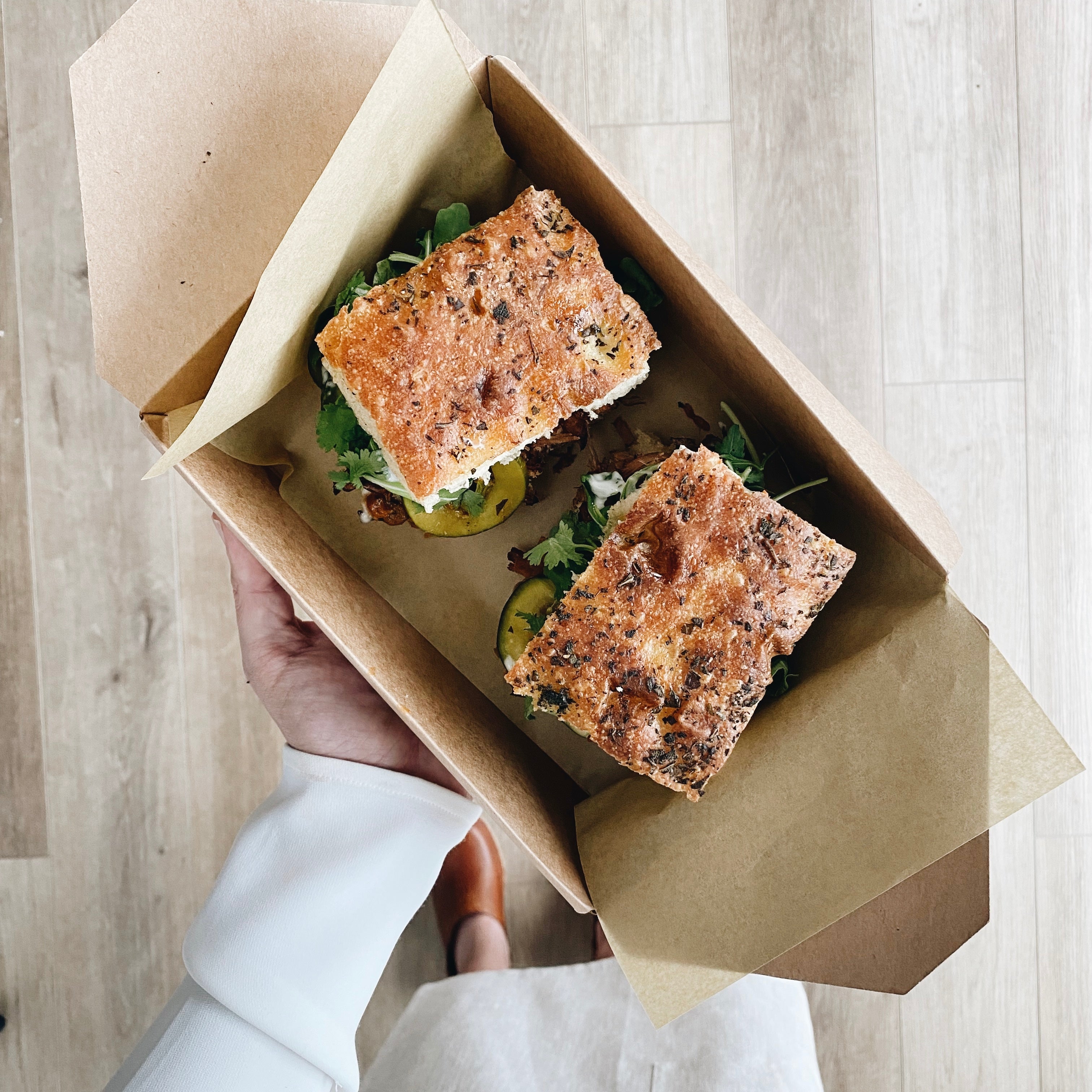House slow braised pork, house made seasonal pickles, house BBQ sauce, organic cilantro, organic arugula, house herb aioli served on our house herb focaccia, baked fresh every morning.